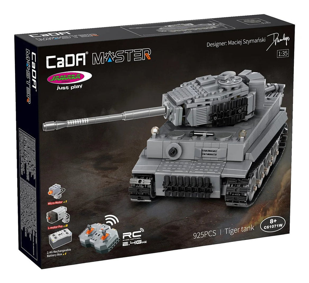 Descubre el mundo de CaDA Bricks en JAMARA – ¡creatividad, variedad y diversión para todos! Tanto para pequeños inventores como para grandes constructores, los bloques de construcción de alta calidad de CaDA ofrecen infinitas posibilidades para crear modelos impresionantes. Cada set destaca por su ajuste perfecto, fabricación robusta y funciones emocionantes – ideal para mentes creativas de todas las edades. Construye siguiendo las instrucciones o deja volar tu imaginación. Con CaDA Bricks de JAMARA, abres una nueva dimensión en la construcción – tu mundo, bloque a bloque. Con el set CaDA no solo construyes un modelo, ¡das vida al legendario tanque Tiger a escala 1:35! Este modelo completamente controlado a distancia destaca por su diseño detallado, mecánica realista de las orugas y numerosas funciones controladas manual y electrónicamente. La torreta giratoria 360° y el cañón ajustable manualmente garantizan una operación realista. Gracias al control remoto de 2.4 GHz, manejas el modelo con precisión hacia adelante, atrás, izquierda y derecha. Potentes motores y una batería Li-Ion integrada aseguran horas de diversión y un funcionamiento fiable. El kit incluye 925 piezas que se ensamblan fácilmente. La hoja de calcomanías incluida completa el aspecto detallado con estilo. Ya sea para jugar, coleccionar o exhibir, este tanque histórico ofrece conocimiento técnico, diversión y placer de construcción en uno, ideal para constructores desde los 8 años.
