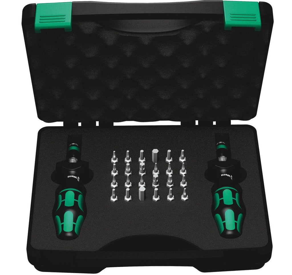 Juego de destornilladores dinamométricos de Wera. Dos destornilladores dinamométricos con un ajuste del par de giro variable con altísima precisión del valor. Un destornillador lleva un mango Kraftform tipo pistola para una transmisión del par de giro especialmente alta, multicomponente para mayores velocidades en aplicaciones de atornillar así como para un trabajo especialmente ergonómico. El ajuste del valor del par de giro necesario es muy descomplicado y se puede realizar sin herramienta auxiliar. La escala de valores se puede leer muy fácilmente. La tecnología Rapidaptor de cambio rápido permite un cambio ultrarrápido de las puntas. El par de desapriete es ilimitado para poder soltar tornillos fuertemente agarrotados. Con un mango Kraftform multicomponente que dispone de una zona dura y una zona blanda para alcanzar altas velocidades de trabajo y, al mismo tiempo, cuidar la palma de la mano del usuario. Incluye un surtido de puntas en una caja de material plástico de alta calidad y sumamente estable.