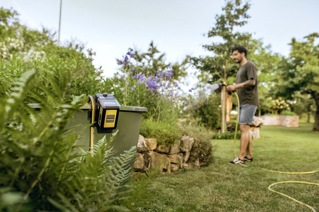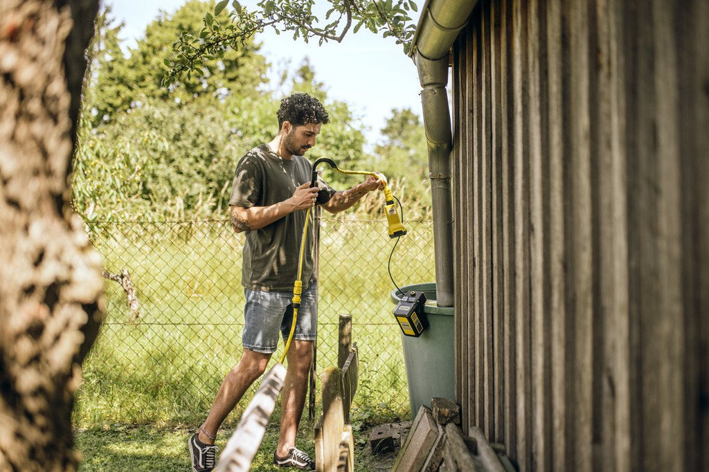 Sostenible y económico: la bomba sumergible de vaciado BP 2.000-18 Barrel es la solución perfecta para jardines sin conexión a la corriente y para sustituir las regaderas. Gracias al agua de lluvia gratuita y llena de nutrientes procedente del bidón de recogida de agua de lluvia, se ahorra mucho dinero en agua potable. La fijación en el borde del barril permite la fijación perfecta de diferentes barriles, así como un uso cómodo para la espalda mediante un interruptor de encendido y apagado y la batería. La tapa de la batería transparente permite una visión perfecta de la pantalla de la batería en tiempo real. Para evitar que la manguera que sale del barril se doble al regar, se incluye una guía de mangueras, que garantiza un flujo de agua constante. Esta guía de mangueras puede adoptar 3 posiciones en función del campo de aplicación y según sea necesario: o bien conectada a la izquierda o a la derecha del soporte del barril a batería o bien suelta en un lugar libre en el borde del barril. Gracias a su tamaño reducido, la bomba ligera también cabe en las estrechas aberturas de los barriles como, por ejemplo, el contenedor IBC. El filtro previo integrado protege la bomba de la suciedad.