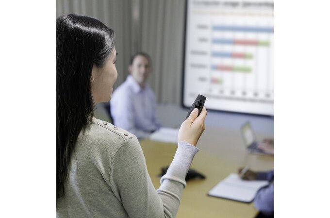 Los prácticos botones LED retroiluminados mueven sin problemas las diapositivas de presentaciones PowerPoint o Keynote, además de la opción de pantalla a negro y un botón para activar el puntero láser verde