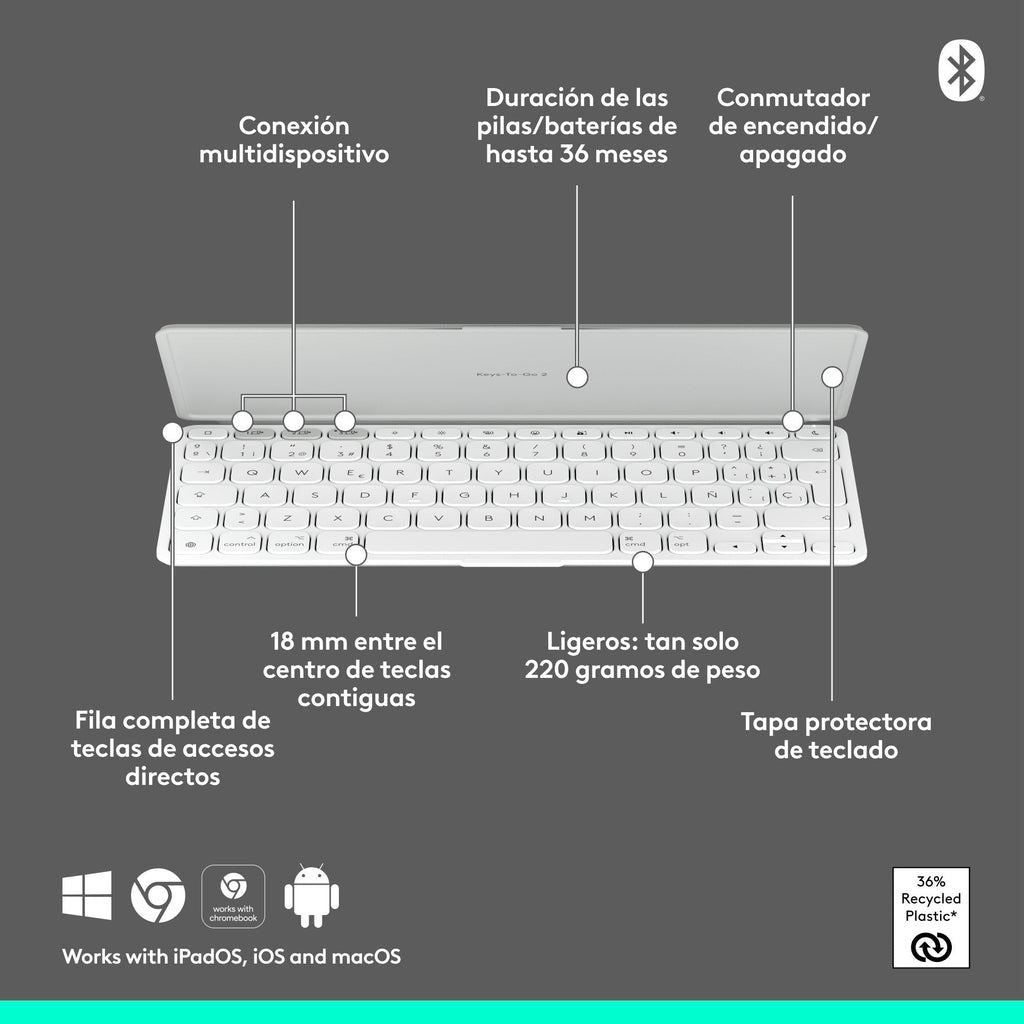 - Para cualquier sistema operativo Apple: usa el teclado inalámbrico Bluetooth Keys-To-Go 2 para iPad con tus dispositivos Apple; compatible con iOS, iPadOS, macOS