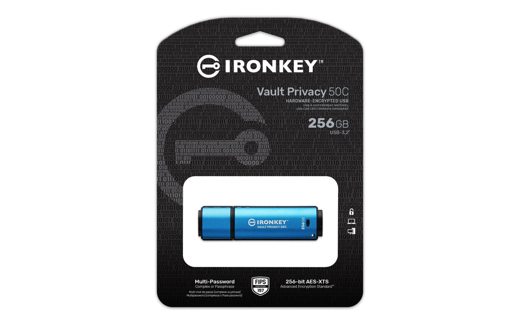 Kingston IronKey™ Vault Privacy 50 Serie incorpora avanzada unidades UBS Tipo A y Tipo-C® que ofrecen protección de grado empresarial, con homologación FIPS 197 y cifrado basado en hardware AES de 256 bits en modo XTS, y que incluye salvaguardas contra BadUSB con firmware de firma digital, así como contra ataques de contraseña de fuerza bruta. VP50 ha sido sometida a Ensayos de penetración (Pen Tested) para verificar su protección de grado empresarial. Por cuanto el almacenamiento cifrado está bajo el control físico del usuario, la serie VP50 resulta más eficiente que utilizar Internet y los servicios en la nube para proteger los datos.