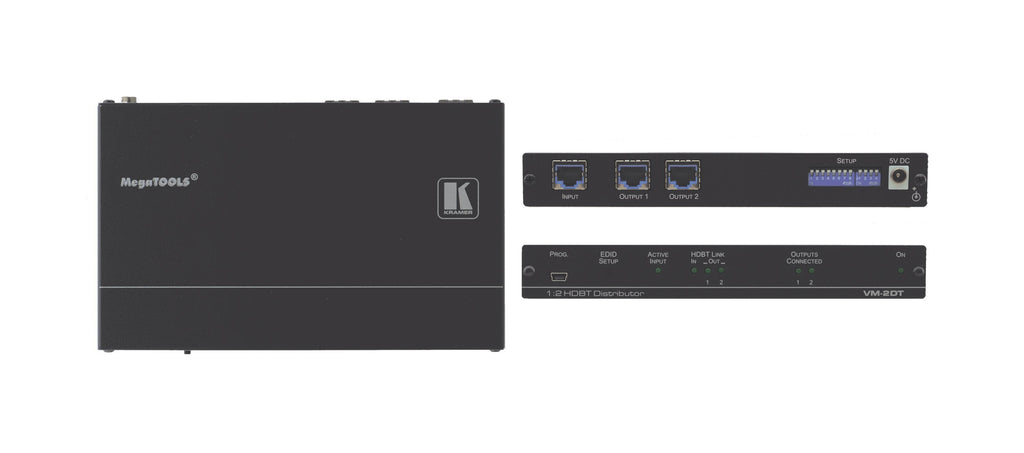 VM−2DT es un extensor de rango y distribuidor de alta calidad para señales 4K@60Hz (4:2:0) HDBaseT. Este equipo ecualiza y regenera la entrada HDBaseT y la distribuye a dos salidas idénticas HDBaseT. El VM−2DT distribuye las señales HDBaseT con una resolución máxima 4K, permitiendo re−extender la señal a larga distancia.