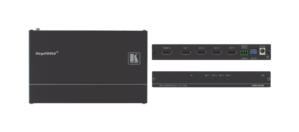 El VM−3H2 es un distribuidor amplificador 1:4 para señales HDMI 2.0 4K HDR, que cumple con estándar de protección HDCP 2.2. La unidad ecualiza y regenera la señal de entrada y la distribuye a cuatro salidas idénticas.