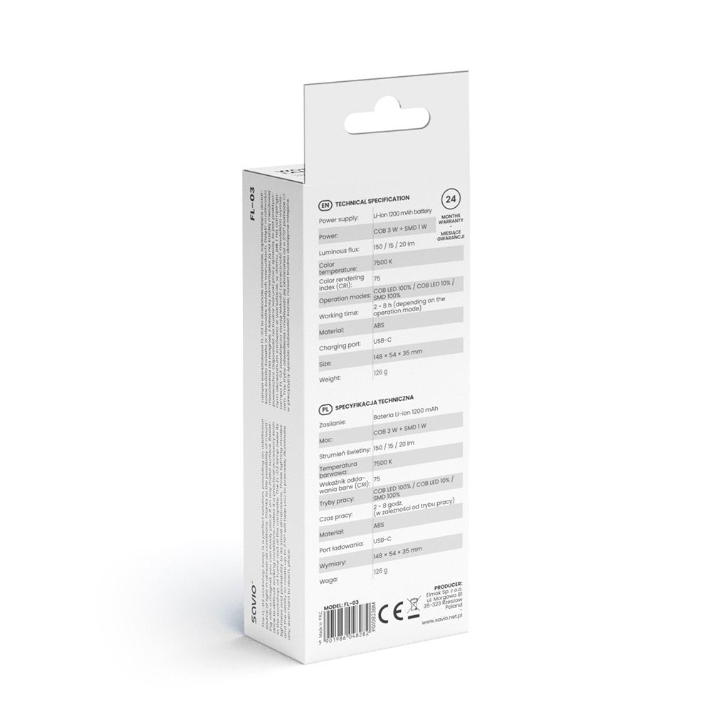La lámpara FL-03 se presenta en un elegante color negro y está fabricada con material ABS de alta calidad. Pesa tan solo 126 g y tiene unas dimensiones compactas de 148 × 54 × 35 mm, lo que facilita su manipulación. Ofrece un amplio alcance de iluminación y puede funcionar de 2 a 8 horas de manera continua según el modo seleccionado, recargándose cómodamente mediante un conector USB-C.