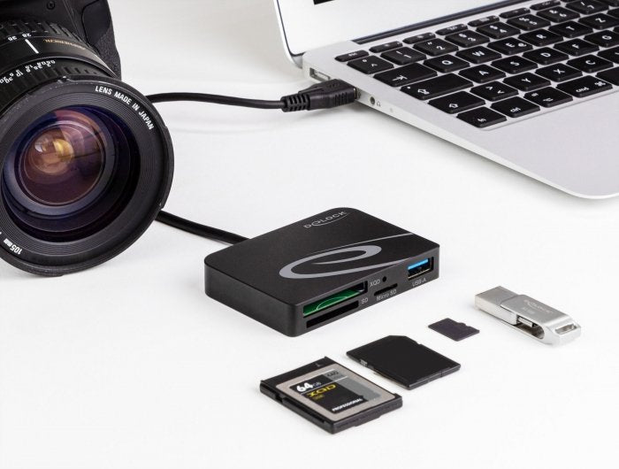 El lector de tarjetas de Delock se puede utilizar para leer y escribir tarjetas de memoria XQD, SD y Micro SD. El lector de tarjetas se puede conectar a un equipo de sobremesa o portátil mediante la interfaz USB Tipo-A.