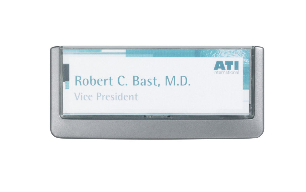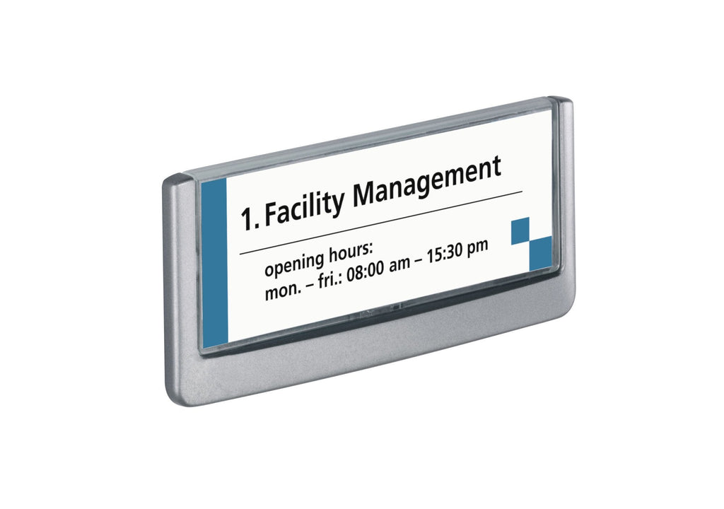 Identificadores para puertas color grafito que combinan diseño y funcionalidad. Ventanilla abatible para facilitar el cambio de etiqueta. Las etiquetas se cambian con facilidad simplemente abriendo y cerrando la ventanilla. Ideales en entornos donde la información se cambia con frecuencia, como hoteles y centros de conferencias. Se pueden pegar o atornillar a la pared. Incluye cartulina, material e instrucciones de montaje. Impresión sencilla y profesional gracias al software que se descarga gratuitamente.