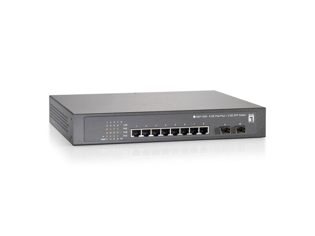 8 puertos PoE-Plus Gigabit Ethernet y 2 ranuras SFP Gigabit