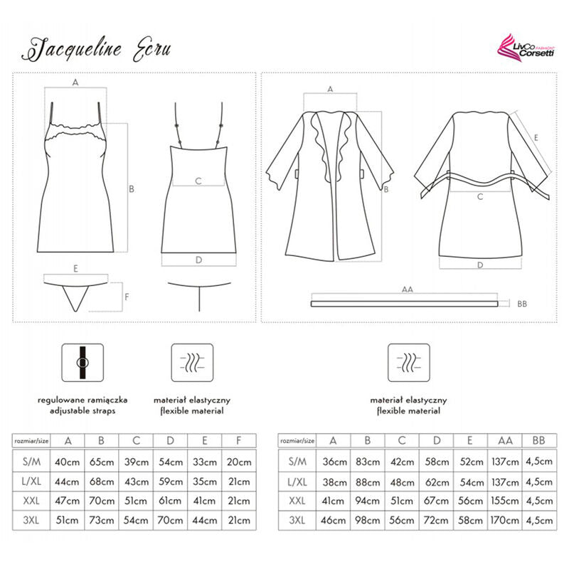 Un conjunto de ropa interior excepcionalmente hermoso hecho de satén crudo brillante, una bata de baño con camisola que llega hasta la mitad del muslo. La parte delantera y las mangas largas de la bata, atadas a la cintura con un cinturón, están decoradas con un bonito encaje. Camiseta de tirantes finos ajustables, decorada con el mismo encaje en el busto. Tanga incluida.