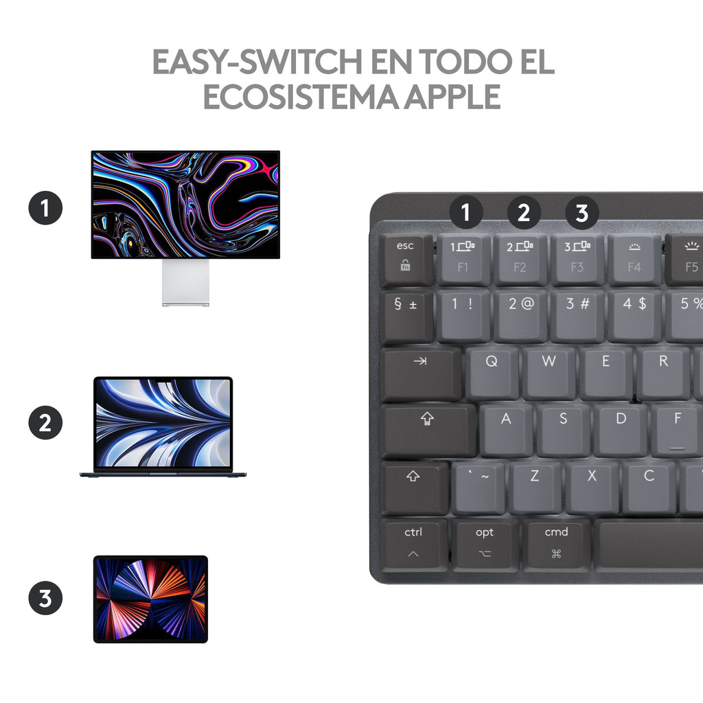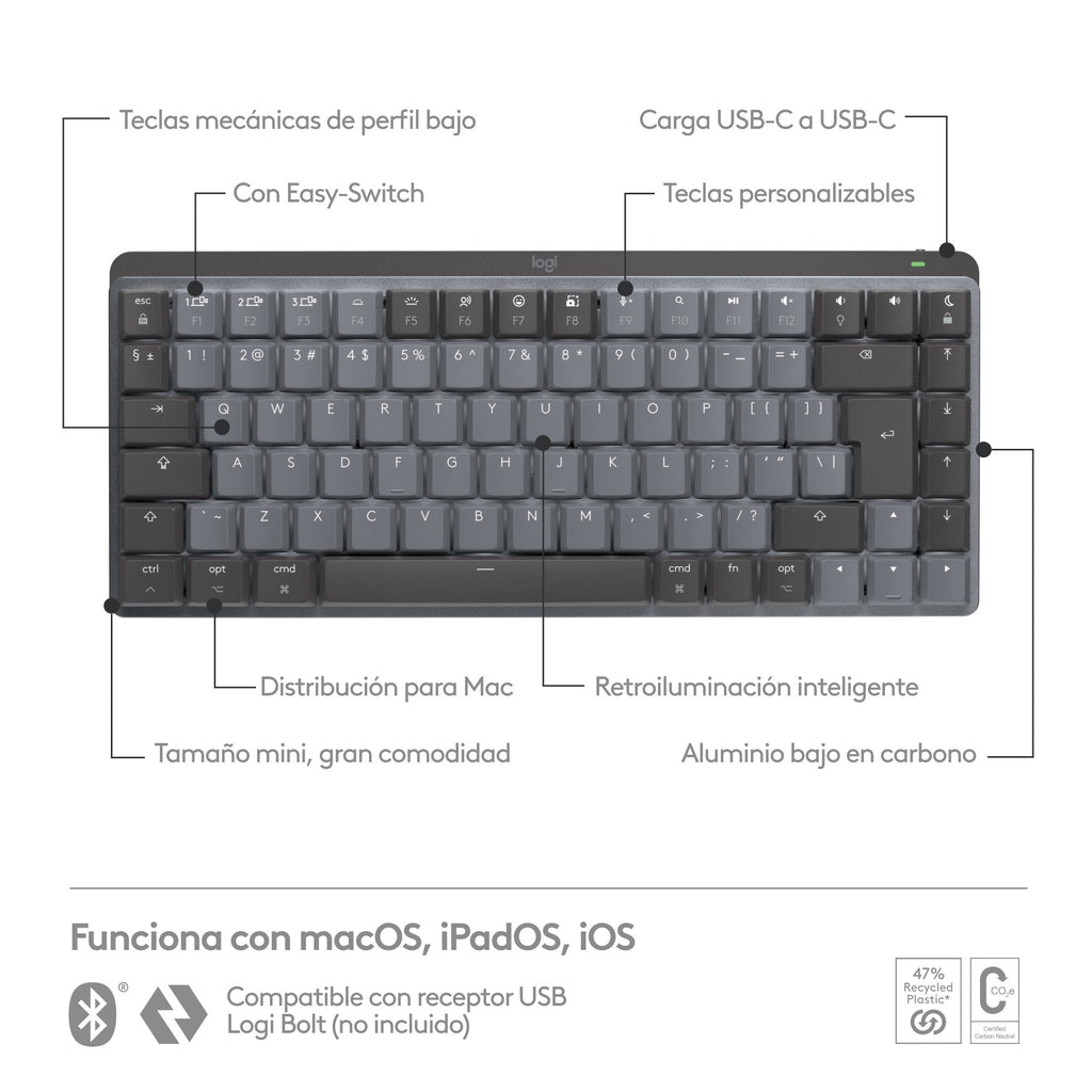 - Optimización para Mac: teclado Bluetooth MX Mechanical Mini para Mac con teclas para Mac diseñadas para la sensación y la productividad, optimizada para macOS y compatible con iPadOS e iOS