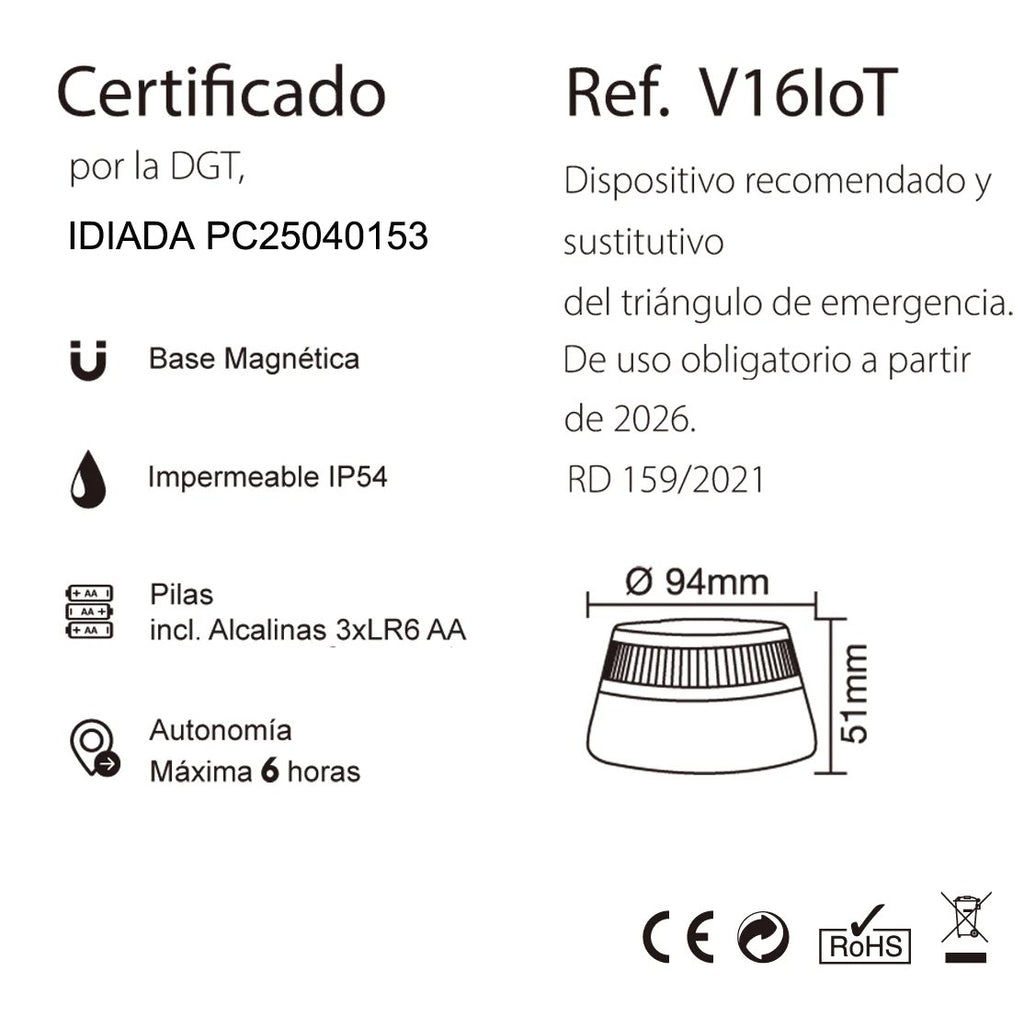 - Homologada por la DGT y obligatoria en 2026: Baliza V16 Ebox certificada oficialmente (LCOE 2023080717), cumple la normativa vigente para garantizar tu seguridad y evitar sanciones.