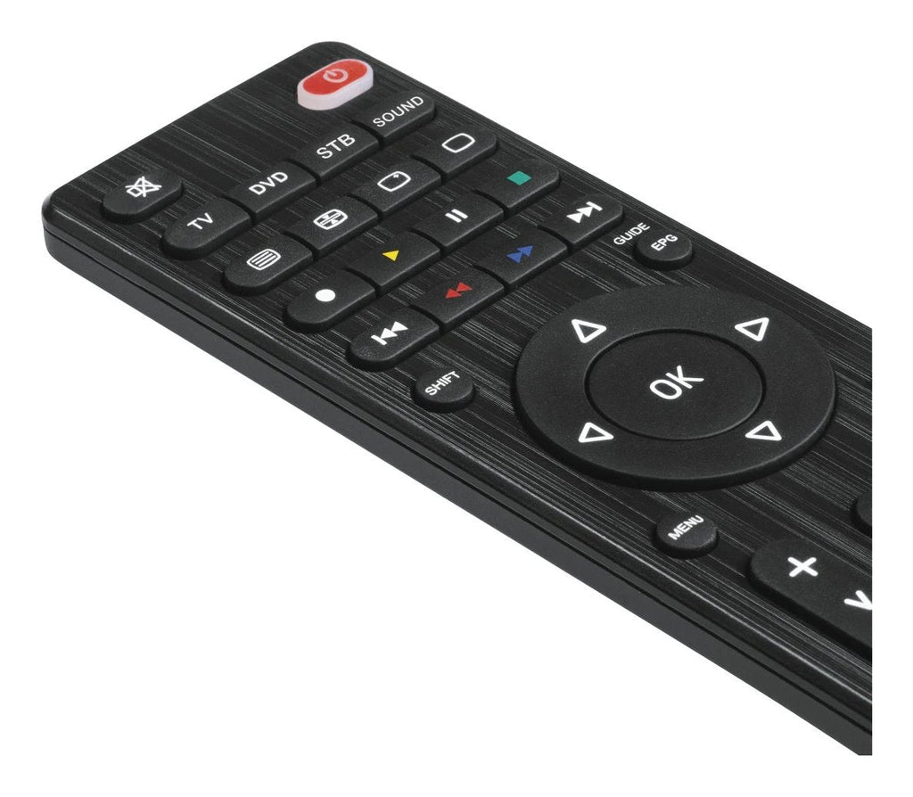 Uno para todos: Con el mando a distancia universal puede controlar la TV, reproductores de DVD, set-top boxes, y grabadores de vídeo (4 dispositivos como máximo) y evitar el uso de varios mandos