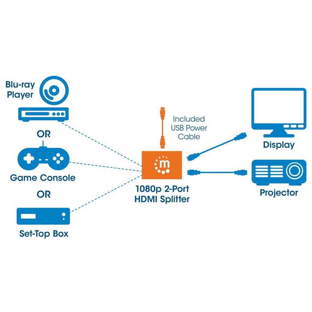 Distribuya una señal individual HDMI a múltiples pantallas.El repartidor Manhattan 1080p 2-Port HDMI transmite la señal de consolas de videojuegos, reproductores Blu-ray y receptores satélite, grabadores digitales, decodificadores de televisión (set-top boxes) u otras fuentes HDMI a dos pantallas HDMI.Una solución flexible para muchas aplicaciones de audio/vídeoIdeal para aplicaciones para ferias, aulas, videoconferencias y para comercios pequeños, el repartidor Manhattan 1080p 2-Port HDMI cuenta con un intensificador (booster) para una señal aún más fuerte. Además, es la solución ideal para repartir y distribuir una señal individual a diferentes pantallas HDMI cuando el equipo base esté guardado en un cuarto seguro u oficina. Los usuarios pueden organizar en cascada unidades múltiples en hasta tres niveles, con salidas HDMI de audio/vídeo a pantallas adicionales en las aplicaciones ampliamente distribuidas. La mejor calidad y fácil instalaciónLa compatibilidad absoluta con HDMI, HDCP 1.0, 1.1 y 1.2, así como con DVI 1.0, garantiza un rendimiento de alta calidad y fiabilidad del repartidor Manhattan 1080p 2-Port HDMI. Conecte rápidamente todos los cables HDMI (no incluidos) y el cable eléctrico USB y esta buenísima solución HDMI estará lista para usar: sin configuraciones complicadas del software o del hardware.