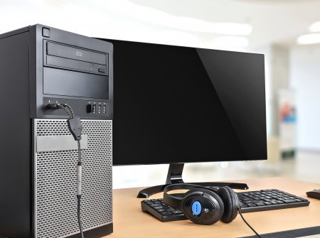 - Permite conectar unos auriculares con plug 3.5 mm a las tomas de altavoz y micrófono de una laptop o PC
