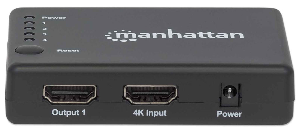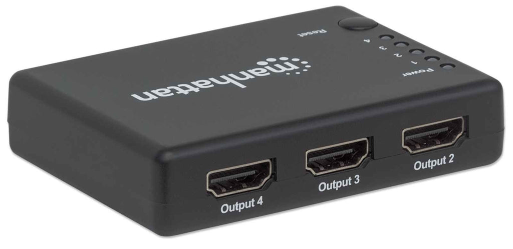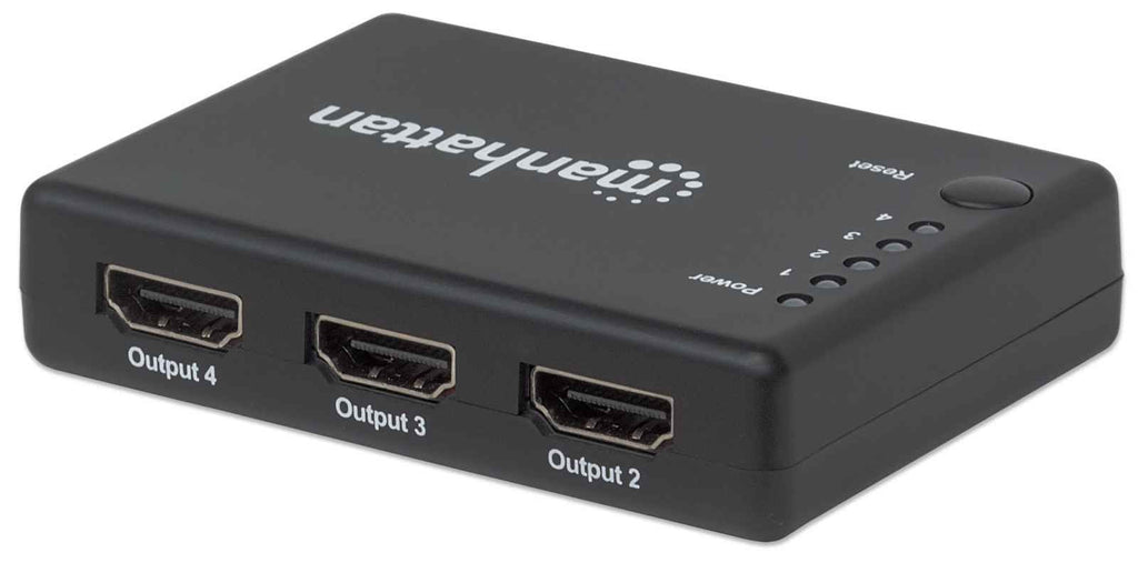 Distribuya una señal individual de Ultra Alta Definición (UHD) a múltiples pantallas.El repartidor Manhattan 4K 4-Port HDMI con intensificador integrado transmite una señal de 4K HDMI de una única fuente UHD a hasta cuatro pantallas UHD. La mejor calidad de imagen y fácil instalaciónLa compatibilidad absoluta con HDMI, HDCP 1.4 garantiza una alta calidad y fiabilidad del repartidor Manhattan 4K 4-Port HDMI. Transmite una resolución cinemática de 4K y admite vídeo 3D, Deep Color, HDR, así como LPCM, DTS y Dolby TrueHD audio. Conecte rápidamente todos los cables HDMI (no incluidos) y el cable eléctrico y esta buenísima solución 4K estará lista para usar: sin configuraciones complicadas del software o del hardware.