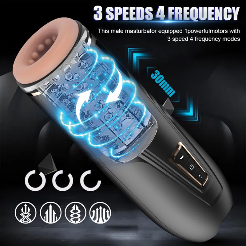 Masturbador masculino con 7 modos y 3 velocidades de función telescópica y rotación. Cuenta con una abertura redonda con un canal texturizado. Muy práctico y sencillo de guardar gracias a su estuche con tapa.