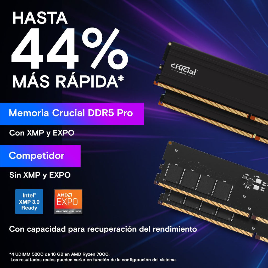 Con el doble de ancho de banda que la generación anterior, Crucial DDR5 Pro permite una multitarea de nuevo nivel y un procesamiento más rápido para poder hacer frente incluso a las cargas de trabajo más pesadas en menos tiempo.
