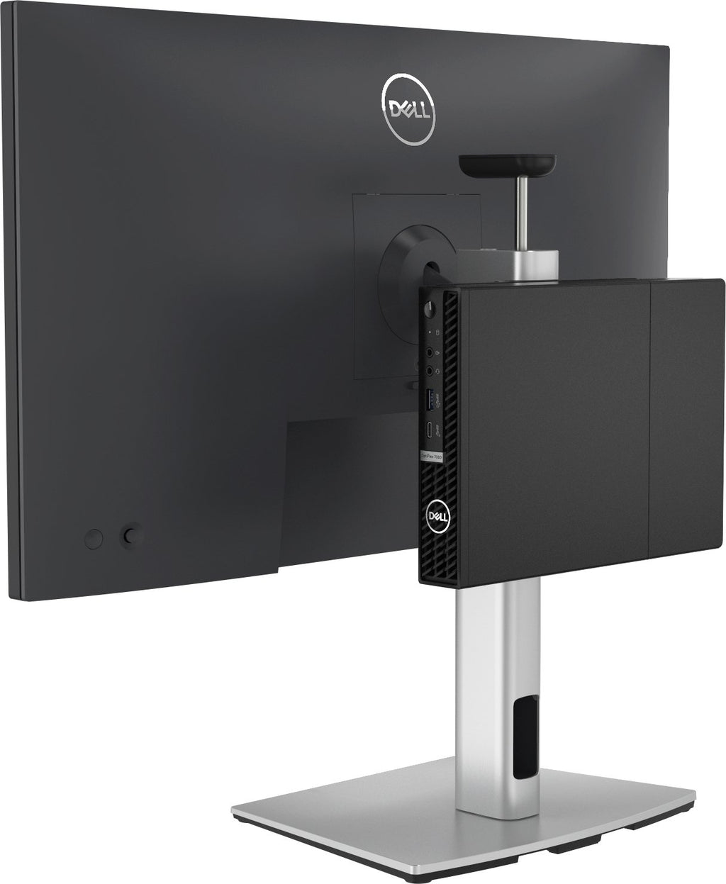 Proteja su microsobremesa OptiPlex y su monitor Dell con una base todo en uno fácil de instalar y un sistema de gestión de cables que garantiza un espacio de trabajo despejado.