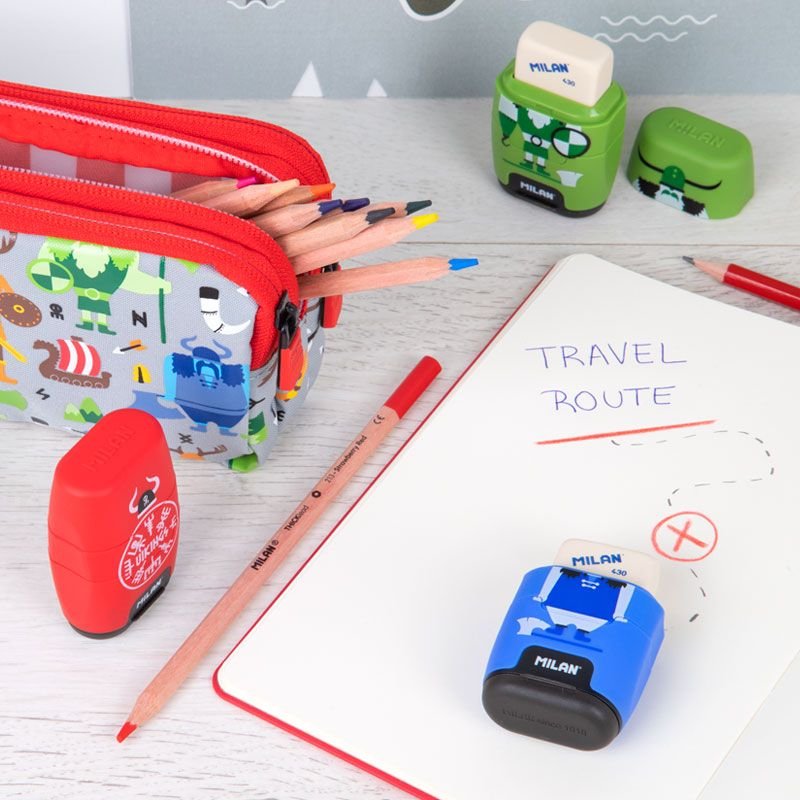 Combinación de goma de borrar y sacapuntas doble (uno estándar y otro MAXI) con depósito. Diseño COMPACT serie especial Vikings. Goma cuadrada suave de caucho sintético tipo 'miga de pan'. El sacapuntas dispone de una cuchilla de acero afilada y resistente, ideal para todo tipo de lápices. Sacapuntas con cuchilla de seguridad: este sistema evita que se pueda separar la hoja del cuerpo del sacapuntas. 3 colores surtidos: azul, rojo y verde. Diseño original creado por el departamento de I+D de MILAN. Gomas de borrar de recambio disponibles (modelo 430). Las gomas de borrar MILAN están fabricadas en España desde 1918.