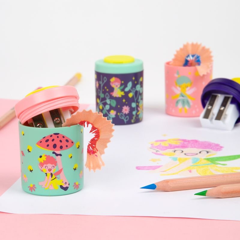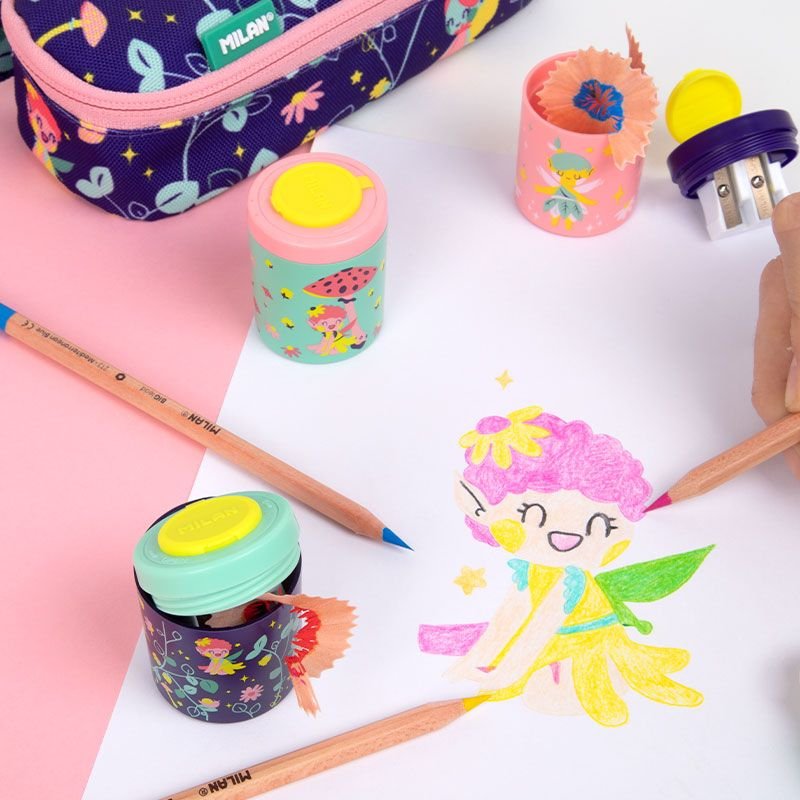 Sacapuntas doble (uno estándar y otro MAXI) con depósito. Diseño COLLECTION, edición especial Fairy Tale. Cómodo tapón con rosca. El sacapuntas tiene una cuchilla de acero al carbono afilada y resistente, ideal para todo tipo de lápices. Artículo con cuchilla de seguridad. Este sistema evita que se pueda separar la hoja del cuerpo del sacapuntas, siendo óptimo para uso escolar. Colores surtidos disponibles: violeta, verde y rosa. Diseño original creado por el departamento de I+D de MILAN