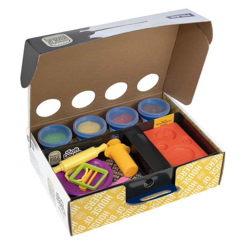 Kit de pasta blanda a base de trigo con herramientas 'Casa de las hamburguesas'. Contenido del maletín: 4 botes de 116 g (de color amarillo, rojo verde y marrón) y 12 piezas (herramientas y moldes). Soft Dough es una pasta consistente y elástica, fácil de model y reutilizable. Se pueden crear nuevos tonos combinando dos o más colores. No deja residuos en las manos. Ingredientes de origen vegetal (contiene gluten). Este juguete fomenta la creatividad y el desarrollo de la psicomotricidad fina.