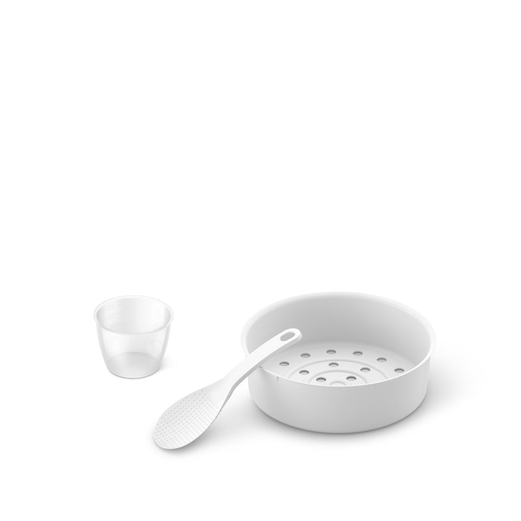 Disfruta de una cocción más cómoda con nuestros accesorios, que incluyen una cuchara de arroz, un práctico vaso medidor y una cesta de vapor para cocinar sin complicaciones.