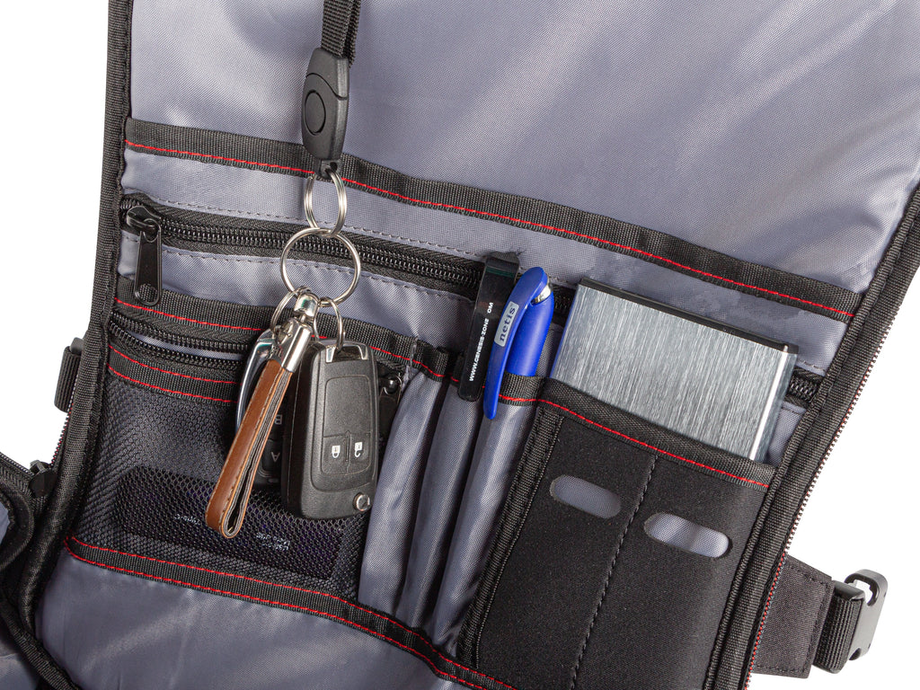 Para cada dispositivo y cada situación, hay un bolsillo adecuado. El compartimento principal cuenta con numerosos bolsillos dedicados: para el ratón, la alfombrilla, el powerbank, varios periféricos y los auriculares. En cambio, el panel frontal está equipado con un organizador para los accesorios de la oficina, las llaves o un pendrive. Simplemente están esperando a ser ocupados.