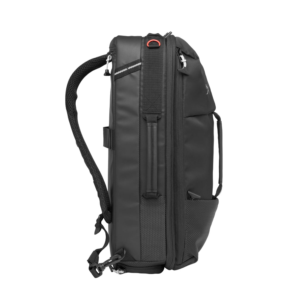 - HyperX Knight cumple la normativa sobre el tamaño del equipaje de mano de la mayoría de las compañías aéreas[1] y el diseño plegable simplifica el control del equipaje. Se sujeta fácilmente a las maletas de ruedas con la apertura integrada para pasar el mango extensible de la maleta.