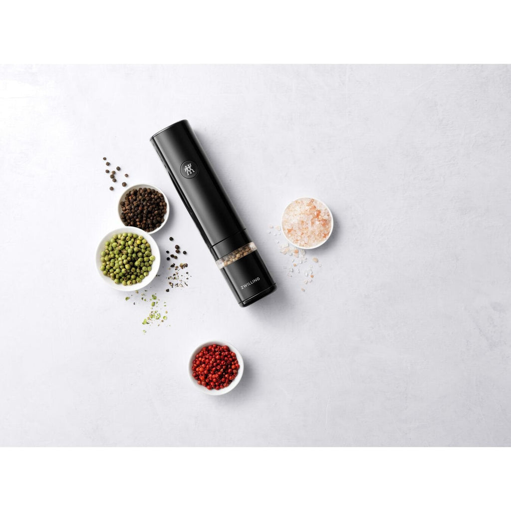 El molinillo perfecto para una comida perfecta. Disponible en blanco o negro, el molinillo de especias ZWILLING ENFINIGY muele eficientemente sal, pimienta y otras especias con solo tocar un botón. Está facilidad de molienda se debe a que el molinillo de sal y pimienta alberga un mecanismo de cerámica de alta calidad. molinillo, fabricado por ZWILLING.