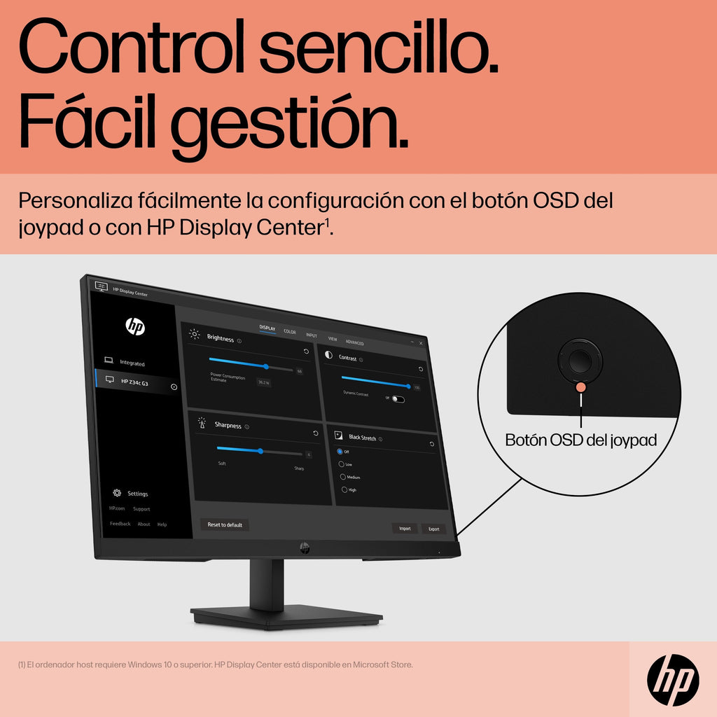 - Personaliza la configuración del monitor a través del botón intuitivo OSD del mando, o directamente en la pantalla con HP Display Center[2] y HP Display Manager[3] para, de este modo, simplificar tu espacio de trabajo.