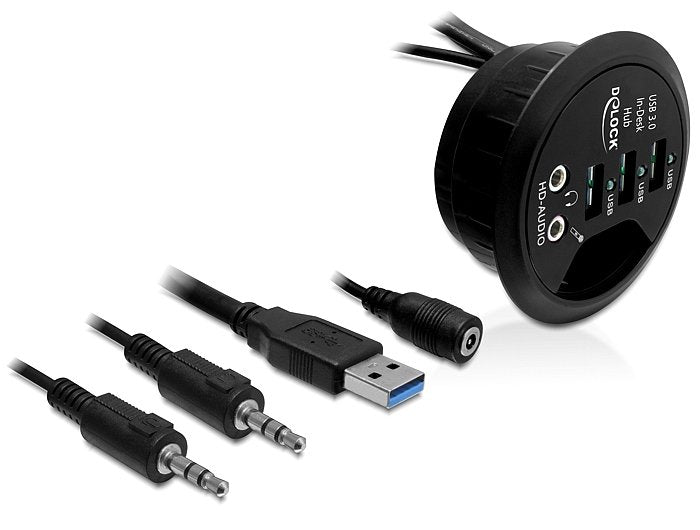 Este Delock Hub se puede instalar en un orificio de su escritorio y le permite recoger los cables del monitor, el teclado y el ratón. Es una solución práctica para ahorrar espacio, lo que le permite conectar de forma sencilla sus dispositivos USB y audio.