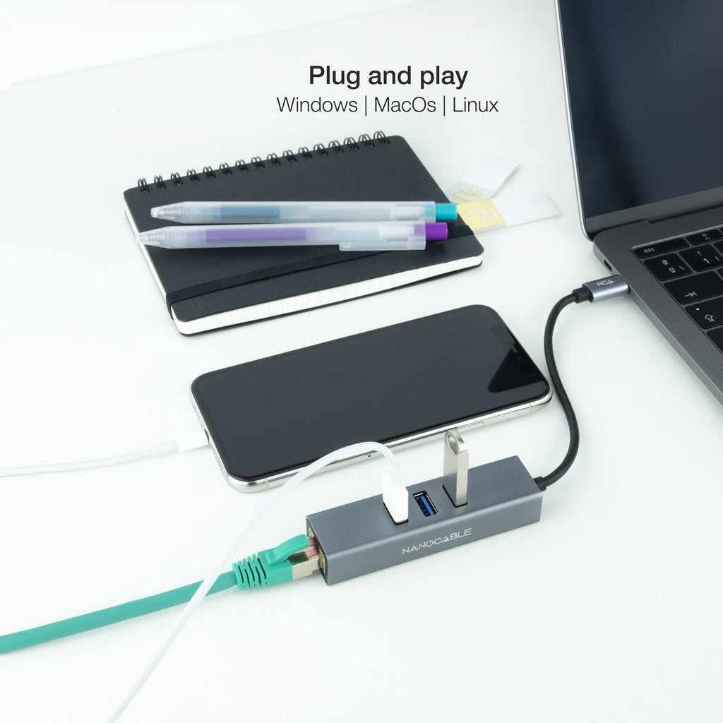Conversor USB-C a Ethernet Gigabit con 3 puertos USB 3.0, con conector USB-C macho en un extremo, conector RJ45 hembra y 3 puertos USB 3.0 hembra en el otro.