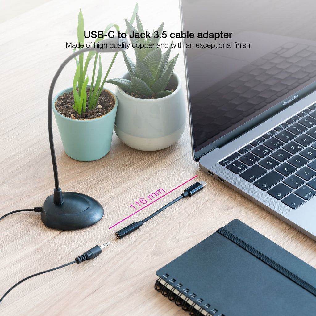 - Cable adaptador de audio de USB-C macho en un extremo y JACK 3.5 hembra en el otro