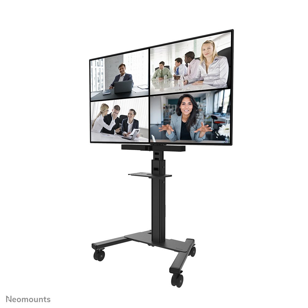 El Neomounts AV1-825BL es un kit de videobar y multimedia opcional para el soporte de suelo móvil FL50S-825BL1. El kit permite la instalación de un estante de cámara independiente y un estante para dispositivos multimedia en el carro. El estante universal de cámara puede instalarse tanto por encima como por debajo de la pantalla y es ajustable en altura y profundidad, para adaptarse a la pantalla. Además, el estante de cámara puede montarse tanto en la parte delantera como en la trasera del soporte. El kit incluye un adaptador para la Bose VB1 y la VB-S (que también se pueden colocar por encima y por debajo de la pantalla).