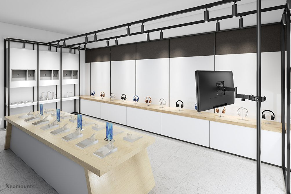 El Neomounts FL40-430BL11 es un soporte de poste de movimiento completo para pantallas planas de hasta 32" con una capacidad de carga máxima de 8 kg. La tecnología versátil de inclinación (60°), giro (180°) y tecnología de rotación (360°) permite crear el ángulo de visión óptimo.