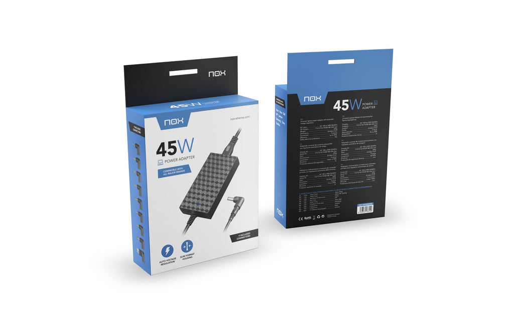 En Nox no queremos que te quedes sin energía en ningún sitio, por ello, hemos diseñado este cargador universal de corriente para portátil con regulación automática de voltaje. Dispone de 9 conectores distintos: 9,5 (ASUS, Sony), 12V (ASUS, HP, Toshiba), 16V (Sony), 19V (HP), 19V (Acer, Dell), 19V (Samsung), 20V (Lenovo), 19V (ASUS), 20V (Lenovo), los cuales abarcan la mayoría de las principales marcas de portátiles del mercado.