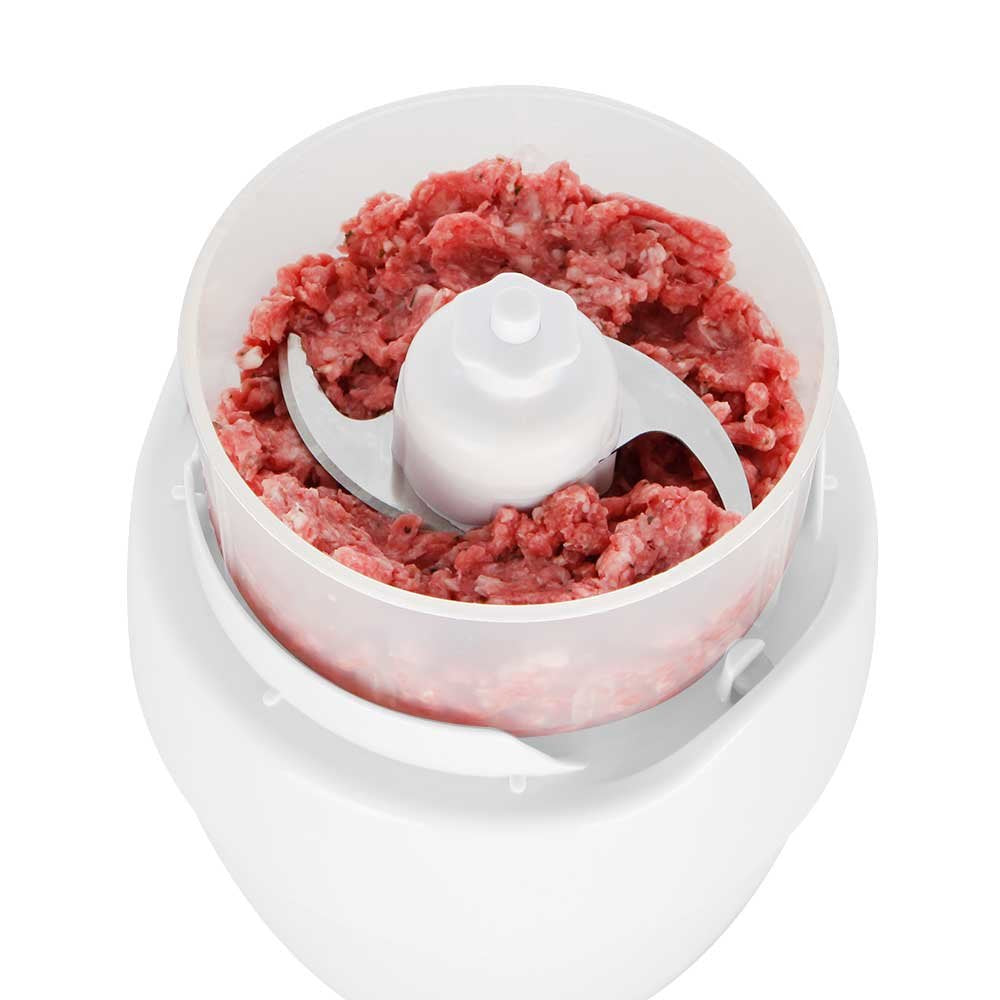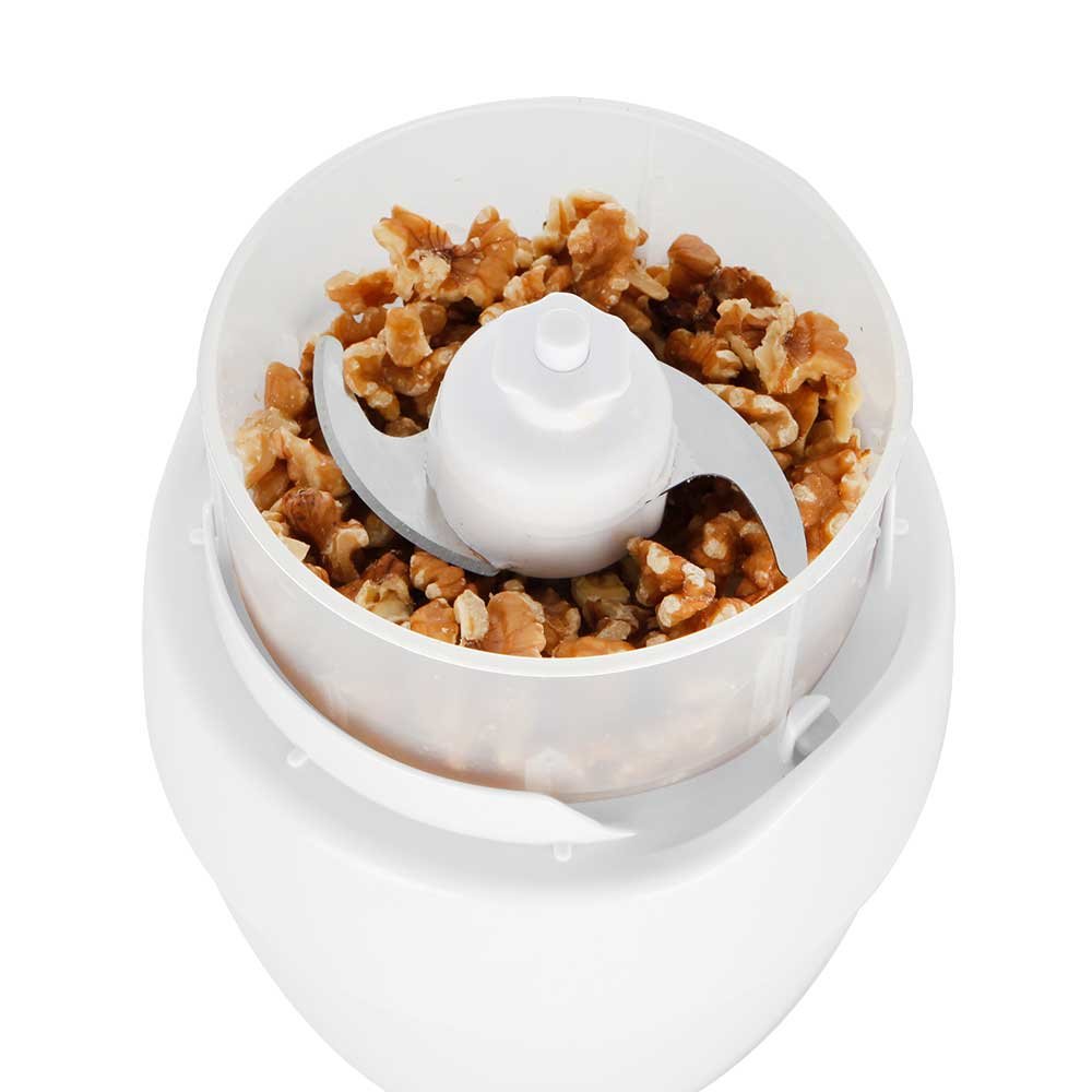 La cuchilla de acero inoxidable extraíble y su potencia de 800 W la convierten en un asistente de cocina ágil y eficaz. En el recipiente transparente con capacidad de 0,6 litros solo hay que colocar los alimentos, pulsar el interruptor integrado para encendido y apagarlo cuando se considere conveniente.