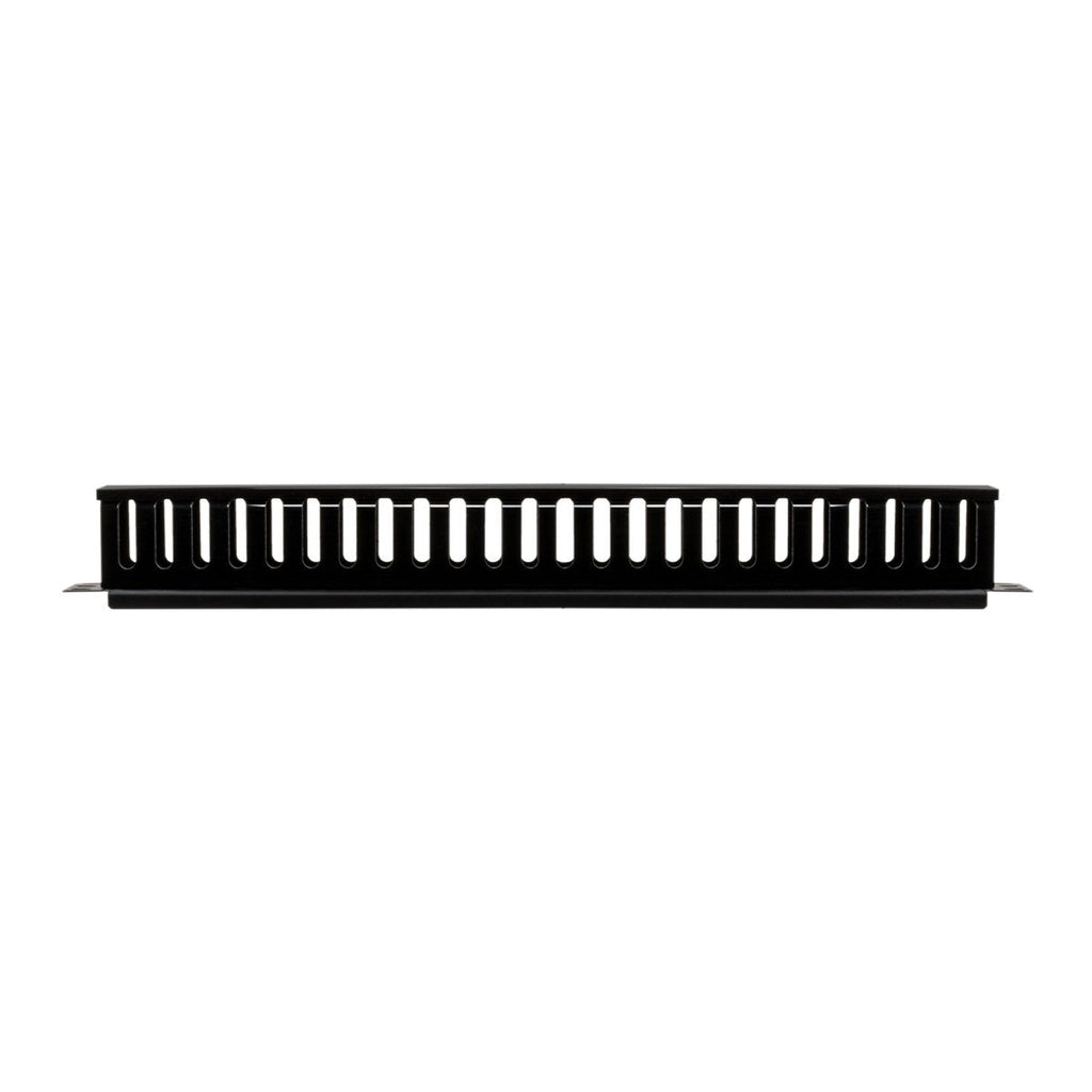 Organizador de cables de plástico en negro con tapa. Modelos de 1U y 2U de 19″.