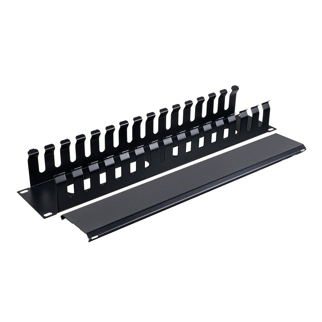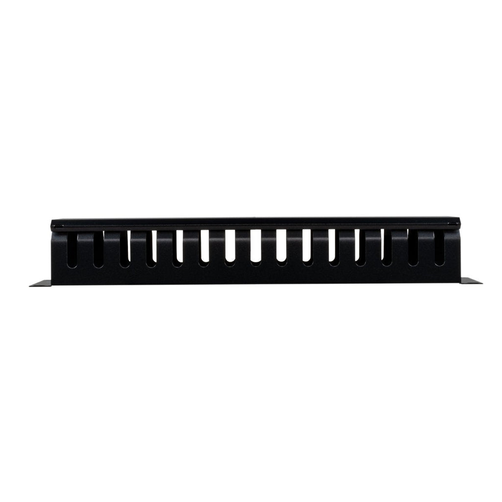 Organizador de cables metálico en negro con tapa. Modelos de 1U y 2U de 19″.