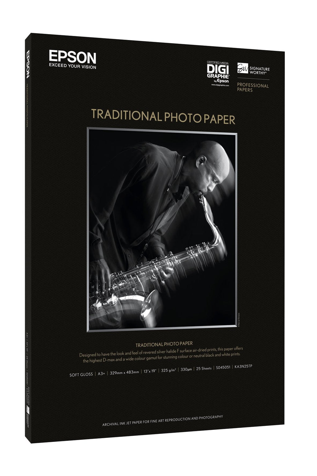 El papel Epson Traditional Photo Paper supuso un salto en la fabricación del papel. Se concibió para su utilización exclusiva con tintas Epson UltraChrome K3 y en colaboración con los principales fotógrafos profesionales de la industria, a fin de garantizar que se cubrían sus expectativas.Muchos de los participantes en el desarrollo del Epson Traditional Photo Paper se dieron cuenta de que sus resultados recordaban mucho a los productos de haluro de plata, por lo que ofrecía más posibilidades a la creatividad por su extraordinaria D-Max y su transferencia de los tonos del blanco y negro. Además, podía imprimir maravillosos colores sobre el mismo papel, algo que con los papeles tradicionales basados en tintas acuosas no era posible. Con la combinación de la fotografía artística tradicional y la sencillez en el control de las impresiones digitales, este papel es un producto único que ofrece tonos negros profundos, excelentes grados de tonalidades y resultados duraderos, como ofrecían los papeles de cámara oscura de anteriores generaciones. Su base de fibras ofrece una superficie rica que aporta colores regulares y un ligero brillo, perfecto para impresiones a color exquisitas, pero también para el blanco y negro. Con la adherencia y el resultado de los papeles de fibras tradicionales.Al igual que todos los innovadores soportes de Epson, este papel ofrece un acabado con la mejor saturación y nitidez. Como siempre, los consumibles de Epson garantizan la calidad Epson.