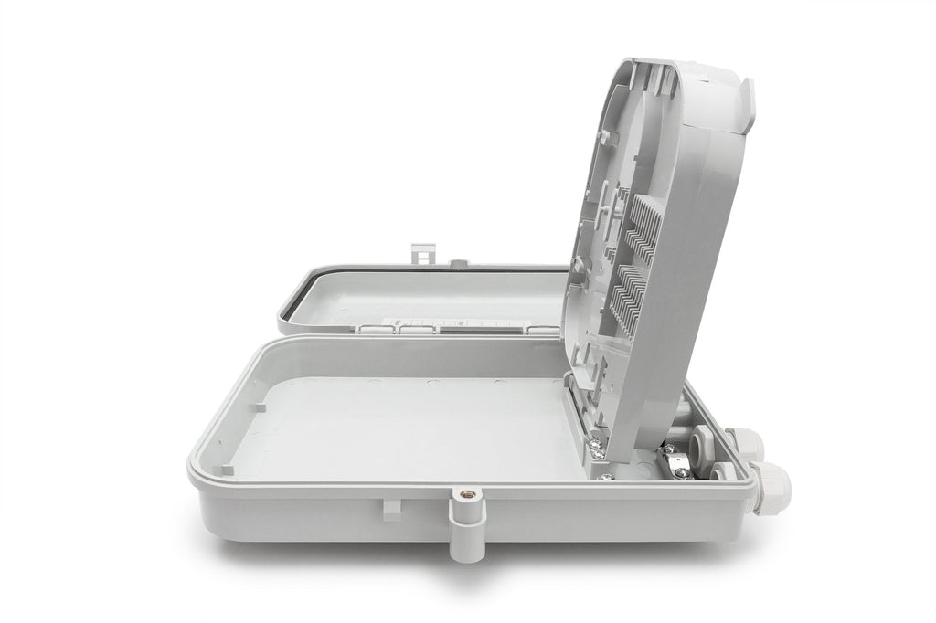 La caja FTTH es adecuada para la instalación en exteriores. Para la distribución de fibra óptica se utiliza un soporte interno para 16 acopladores LC (DX) o SC (SX). Una bandeja superpuesta para latiguillos y varias entradas de cable garantizan las mejores opciones de cableado posibles.