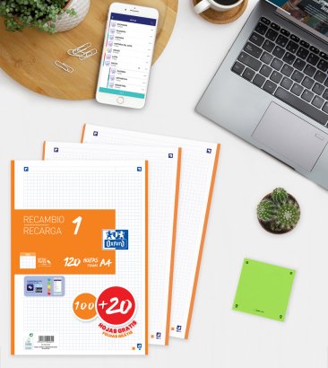 Recambio OXFORD retractilado en paquete de 120 Hojas (100+20) con 1 color de banda y 4 taladros de archivo para poder guardar las hojas en un archivador o carpeta de anillas. Ideal para quienes prefieren hojas sueltas y llevar sólo las que necesiten. Compatible con la app gratuita SCRIBZEE que permite organizar, consultar, compartir y acceder a tus notas en cualquier lugar desde tu Smartphone, tablet o PC.