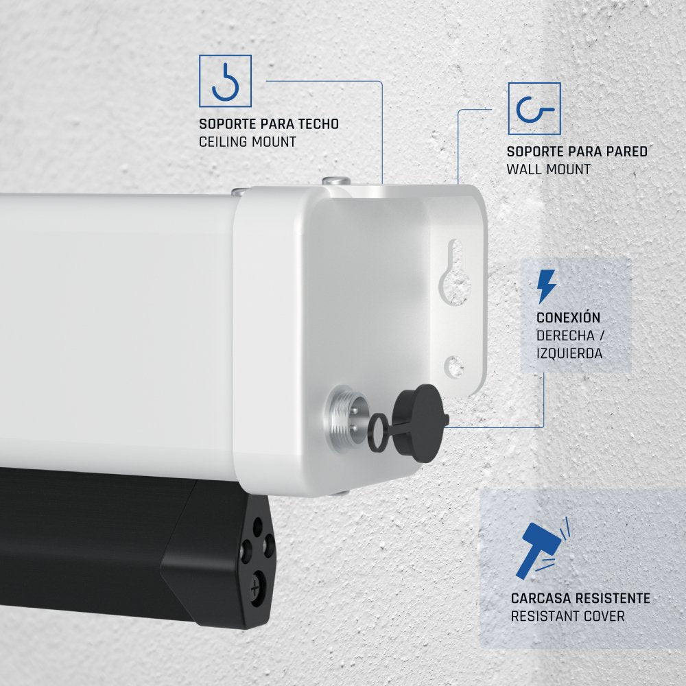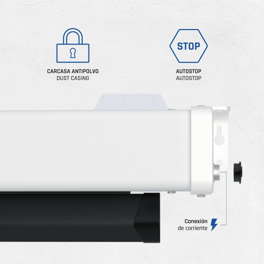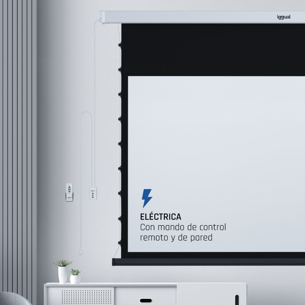 La pantalla de proyección eléctrica tensionada representa el estándar más avanzado en sistemas de visualización profesional. Incorpora cables tensores laterales que garantizan una superficie completamente plana, libre de arrugas u ondulaciones, ofreciendo una proyección de máxima nitidez y precisión.