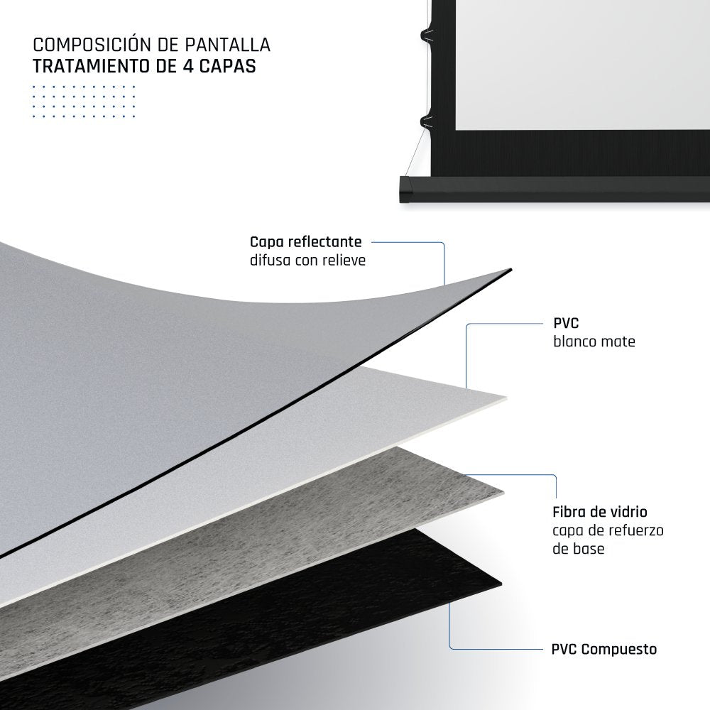 La tela blanca mate utilizada en esta pantalla de proyección es la tela más utilizada en el mercado gracias a sus excelentes prestaciones y a su composición de 4 capas. Su parte frontal es blanca mate y su parte trasera es negra mate. Con un factor de ganancia de 1.0, es perfecta para entornos oscuros, similares a los que te encuentras en los cines y funciona muy bien en ambientes con una ligera luz ambiental.