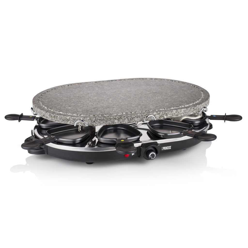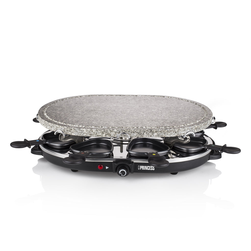 La raclette es una forma tradicional suiza de cocinar juntos que permite a las familias y amigos disfrutar de una tarde agradable cocinando en una mesa. No pase horas y horas en la cocina. Deje que cada uno prepare su plato favorito mientras están sentados a la mesa. La parrilla superior está hecha de piedra de alta calidad para que ase la comida sin aceite ni mantequilla. La parrilla incluye 8 sartenes para cocinar huevos, creps o queso fundido.