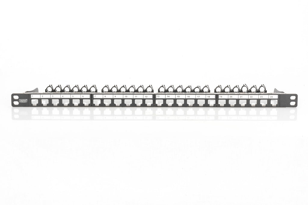 El panel de conexiones DIGITUS® de 24 puertos y 0,5U le ofrece una alta densidad de empaquetado. Como el panel sólo tiene 0,5U de altura, se pueden instalar 48 puertos (2 paneles con 24 puertos cada uno) en 1U.