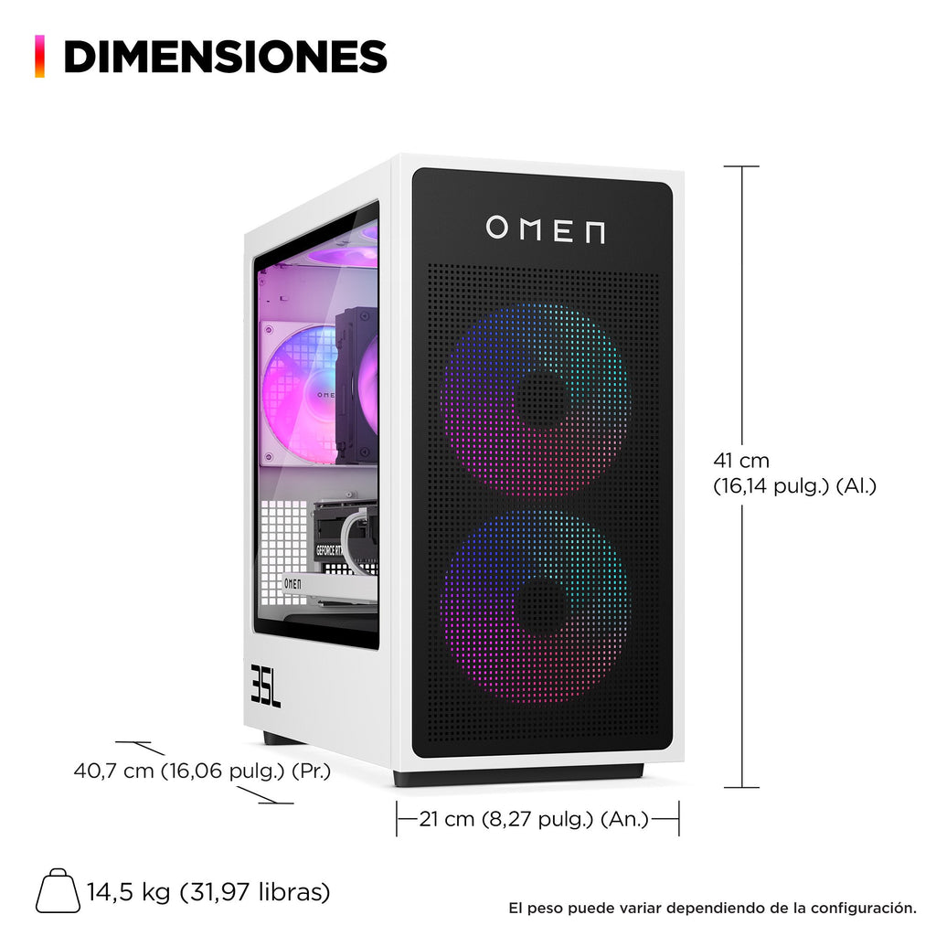 El ordenador de escritorio gaming OMEN 35L libera tu potencial de rendimiento. Incluye el procesador Intel Core™ más reciente y gráficos avanzados, con componentes de la marca OMEN optimizados para ofrecer la máxima potencia y capacidad de refrigeración. Diseñado para una fácil actualización sin herramientas y personalización para adaptarse a tus necesidades de juego.