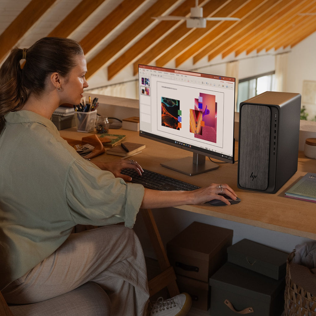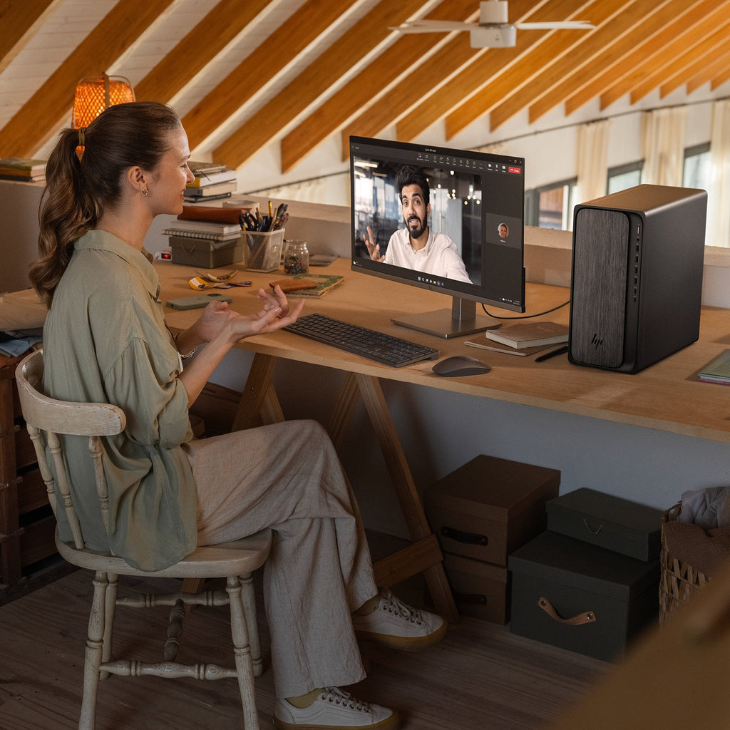 El ordenador HP OmniDesk está diseñado con un moderno acabado inspirado en madera gris que complementa cualquier espacio.
