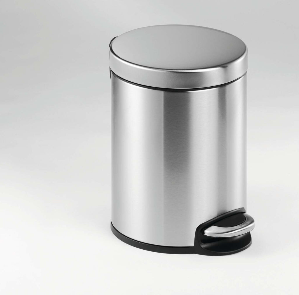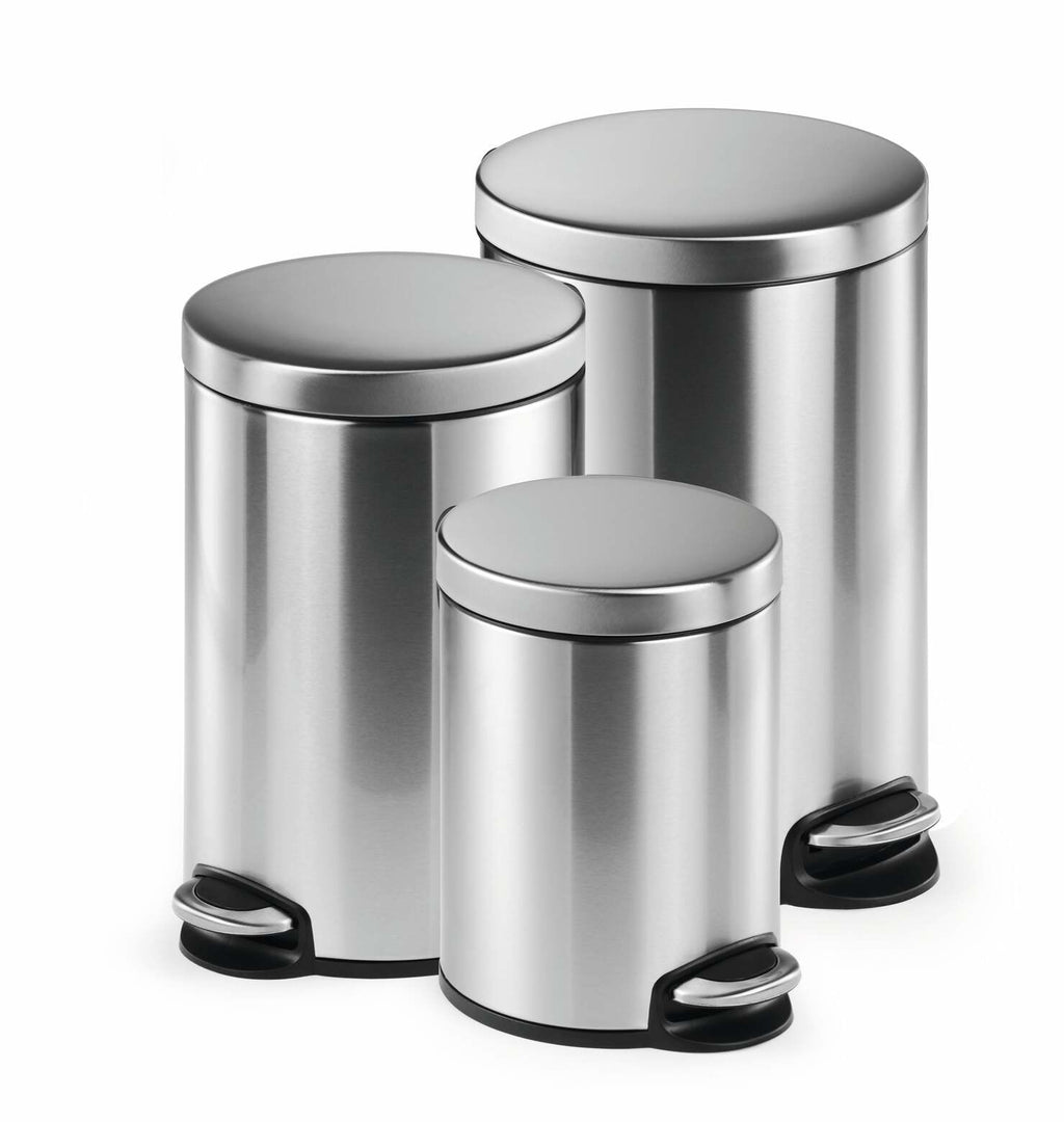 Papelera con pedal redonda inoxidable con revestimiento antihuellas. Recipiente extraíble con asa en el interior. Anillo de goma para sujetar la bolsa. Tapa silenciosa. El reborde plástico de la base aporta estabilidad y protege contra la corrosión. Bisagra con asa para transporte integrada. Contenedor interior con capacidad de 5 litros Medidas: 260 x 290 mm (An X Al); Ø 205 mm