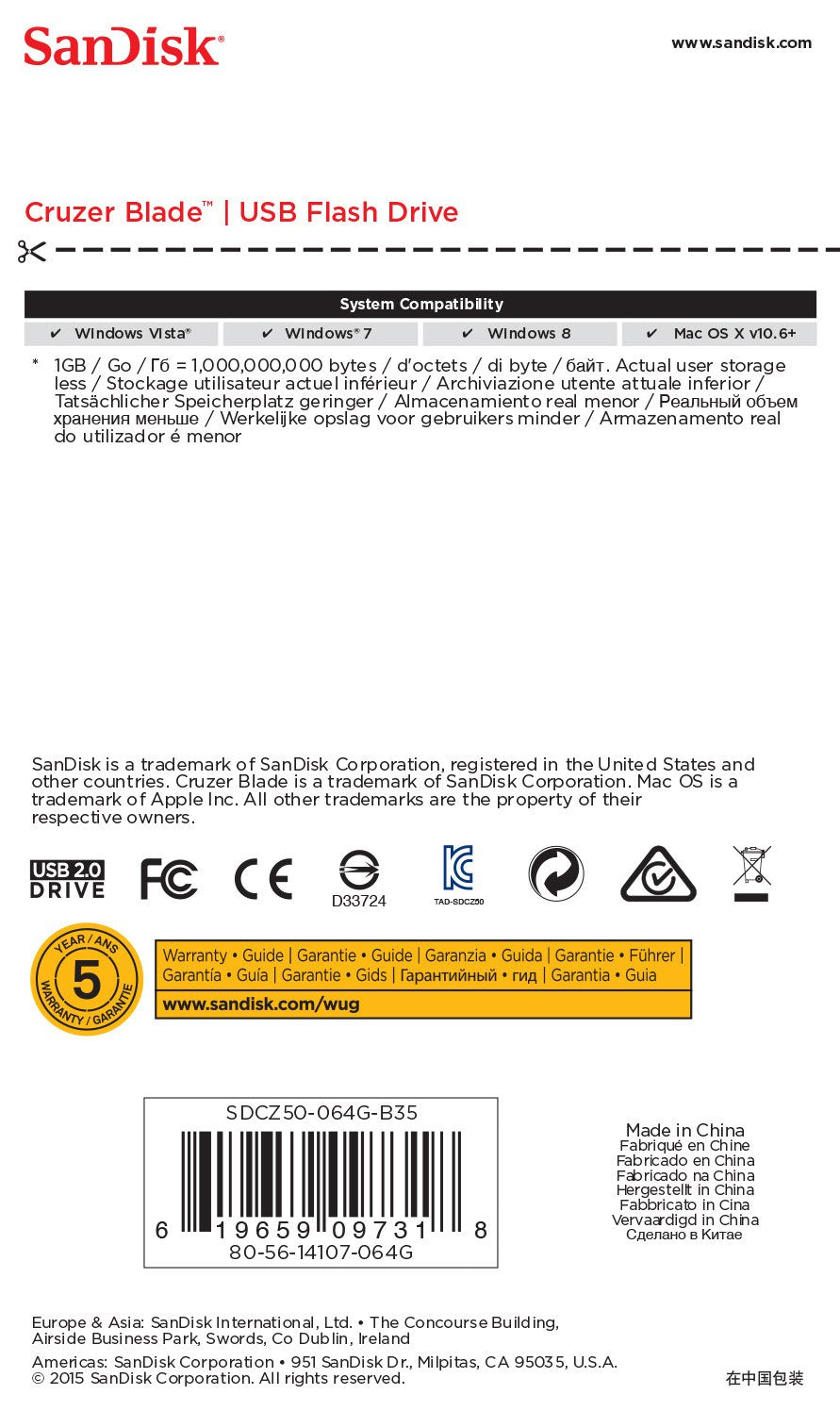 SanDisk Cruzer Blade, 64 GB, USB tipo A, 2.0, Sin tapa, 2,5 g, Negro, Rojo